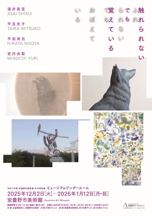 本展では長野県にゆかりのある4名の現代アーティストを招き、展示室や回廊で独自の空間を演出します。淺井真至は、見えないものを掴み取るかのように淡い色彩で抽象的な形、文様やキャラクターを描き続けます。平良光子は生き物を自身の世界の中心に据え、聖書や詩などから着想を得た物語の一場面を、深い祈りの表情を持つ動物彫刻で表現します。平田尚也は、インターネットに漂う画像や3Dデータなどの素材を寄せ集め、AIを用いて、彫刻や映像作品を制作します。宮内由梨はからだの感覚、とりわけ「かゆみ」を起点とした皮膚感覚や内臓感覚に焦点を当てています。